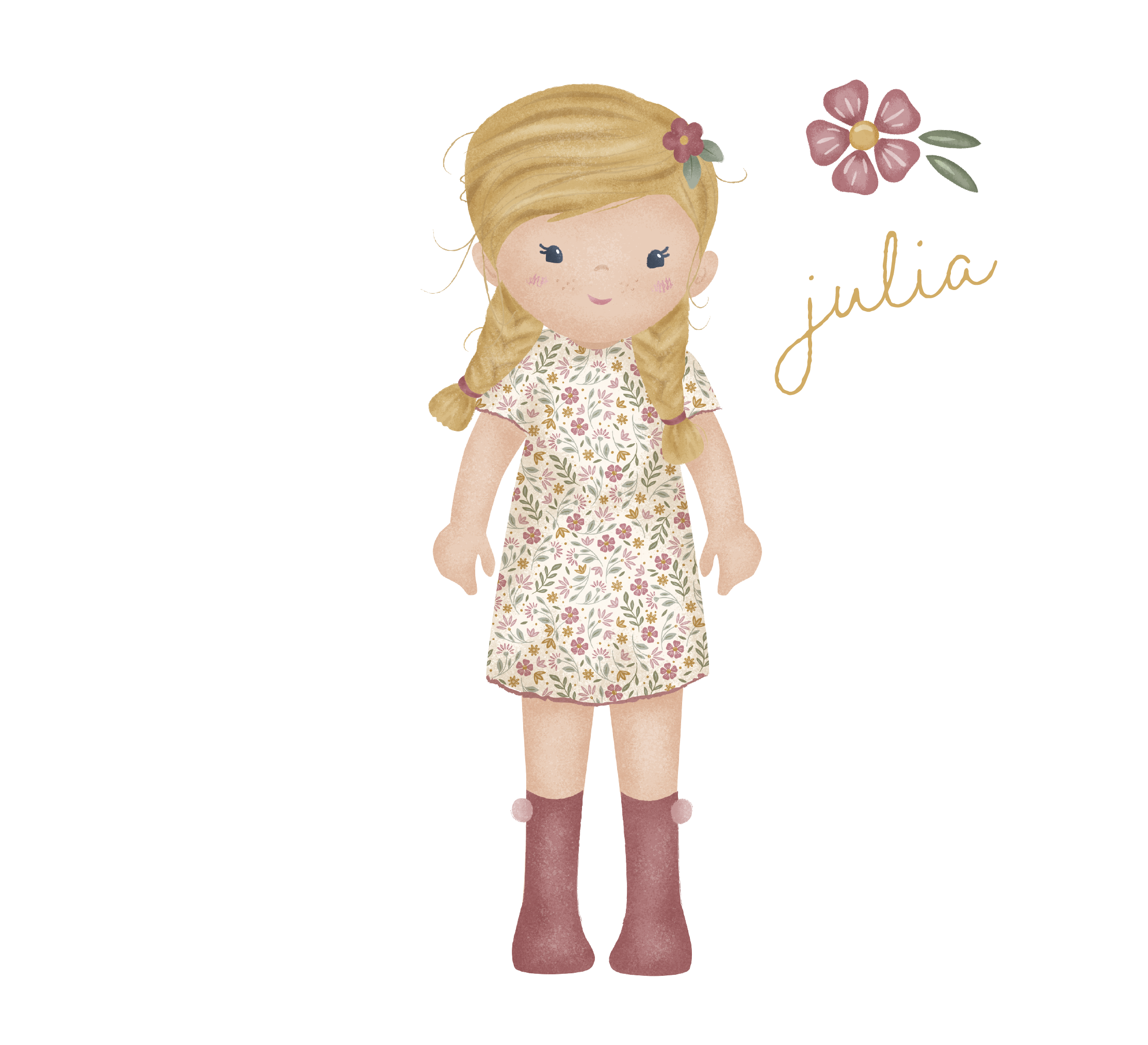 Julia erlebt jeden Tag fröhliche Momente. In ihrer Welt lädt sie dich ein, zu lachen, zu spielen und Spaß zu haben, oder vor dem Schlafengehen davon zu träumen. Julia macht aus jedem Tag etwas Schönes.
