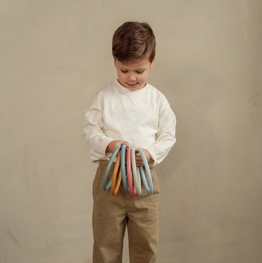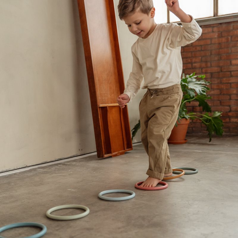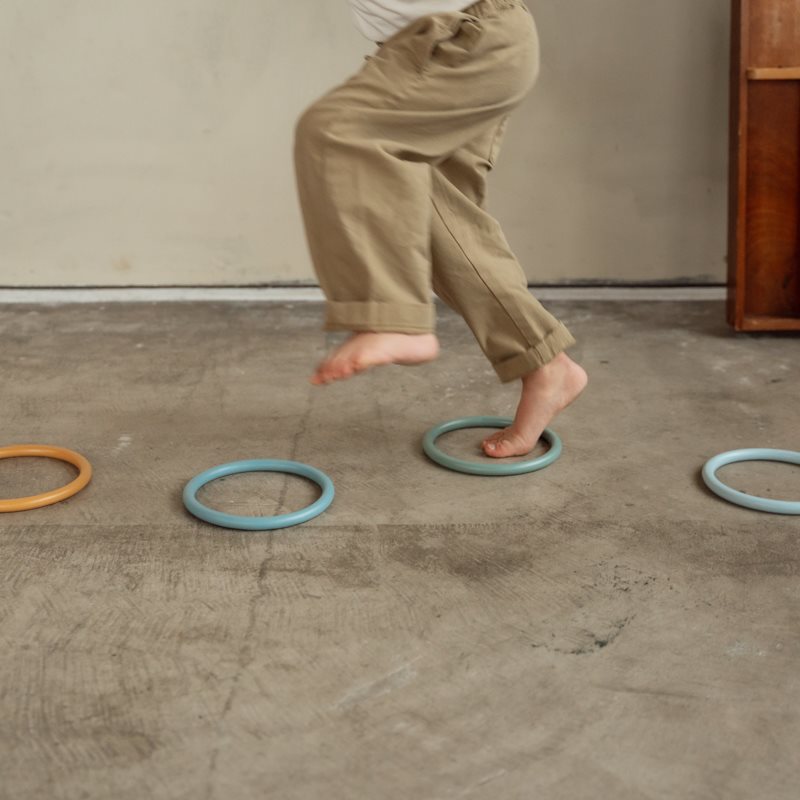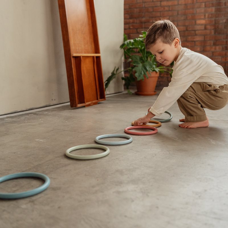 Fangen, tanzen, jonglieren und Ihre eigene Aktivität schaffen! Sie können diese Aktivitätsringe auf endlose Weise spielen. Egal, ob Sie auf einem Bein vom Kreis zu Kreis springen möchten, sie möchte sich um den Arm umdrehen oder Ihre Spielsachen sortieren, diese Ringe können mit jeder Spielaktivität kombiniert werden. Die Aktivitätsringe bestehen aus sanft biegenem Silikonmaterial und sicher für Kinder aus einem Jahr. Stimulieren Sie kreativ und lassen Sie Ihren Kleinen die Ringe instinktiv für eine großartige Spielzeit verwenden, während die Hand-Augen-Koordination entwickelt wird.