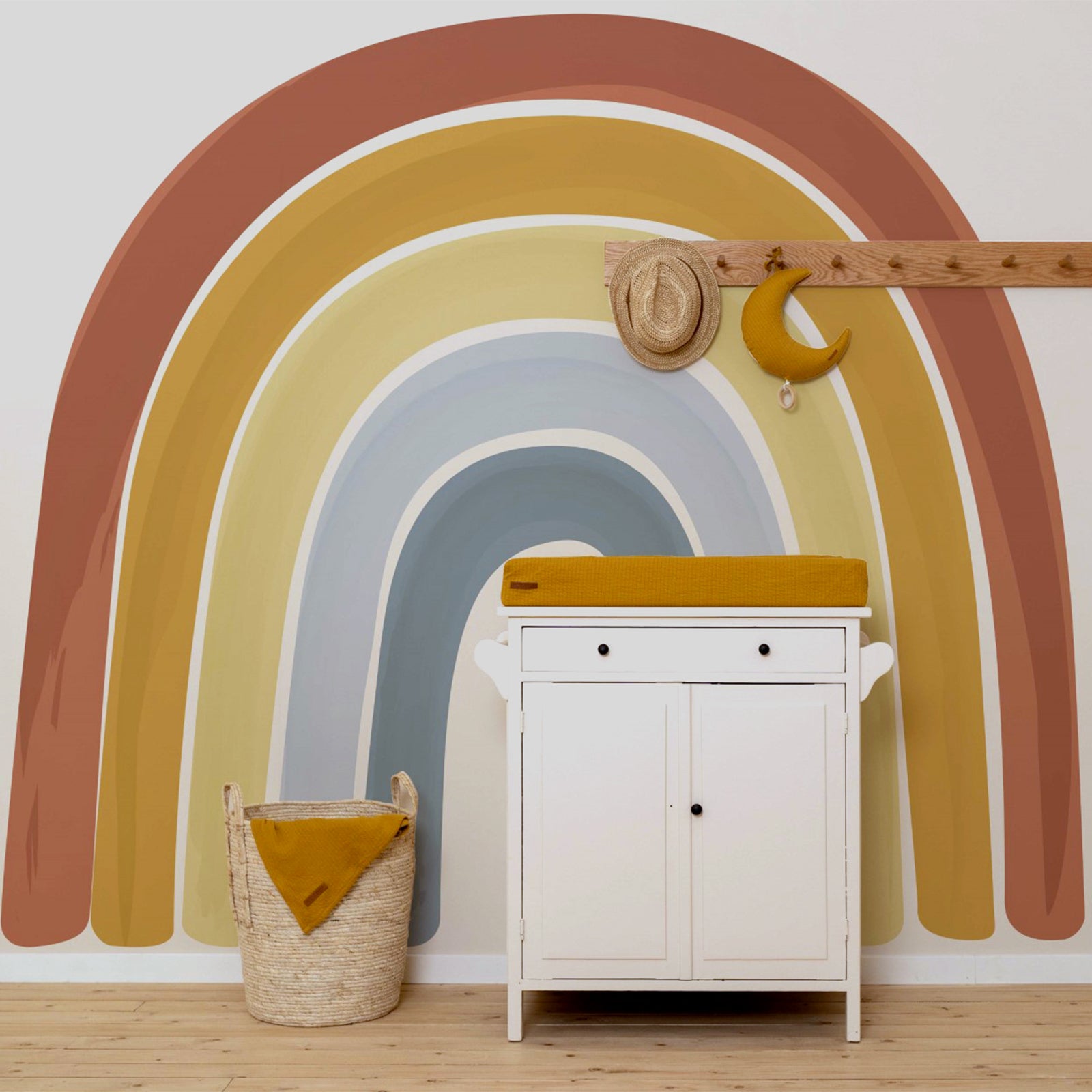 The Rainbow wallpaper by Little Dutch creates a soft and calm atmosphere in the nursery or children’s room. The all-over design covers the wall with a large rainbow in natural tones and adds a warm feeling to the space.