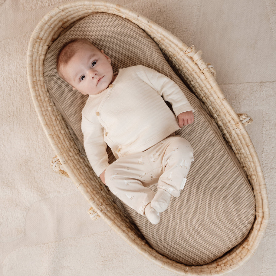 The natural shades of beige, white, and warm brown create a soothing palette—perfect for those very first days of life.
