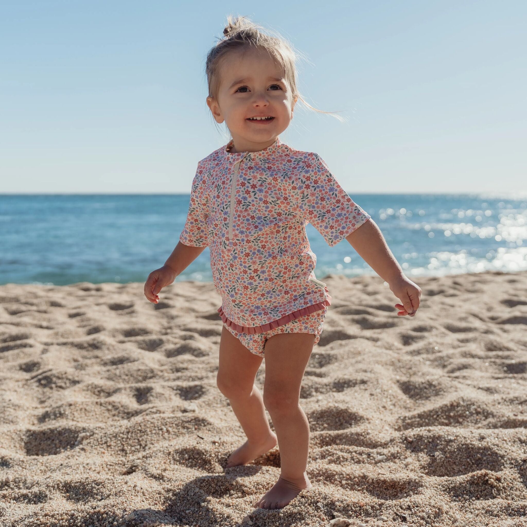 Een vleugje zomer met het roze zwemshirt met korte mouwen Dreamy Flowerfield. Het is een perfecte keuze voor zonnige dagen vol waterpret. De lichte bloemenprint straalt rust en vrolijkheid uit, terwijl de ruches langs de zoom zorgen voor een lieve en speelse afwerking. Het shirt heeft een handige ritssluiting, waardoor je het gemakkelijk aan- en uittrekt – ideaal voor beweeglijke kleintjes die geen seconde willen stilzitten. De zachte, rekbare stof biedt volop comfort en beweegt soepel mee tijdens elk avontuur in het water. Of je nu gaat zwemmen, spelen op het strand of pootjebaden in de tuin – dit shirt laat je kleintje stralen én beschermt tegelijkertijd. Vergeet de zonnebrandcrème niet om je kleintje te beschermen.