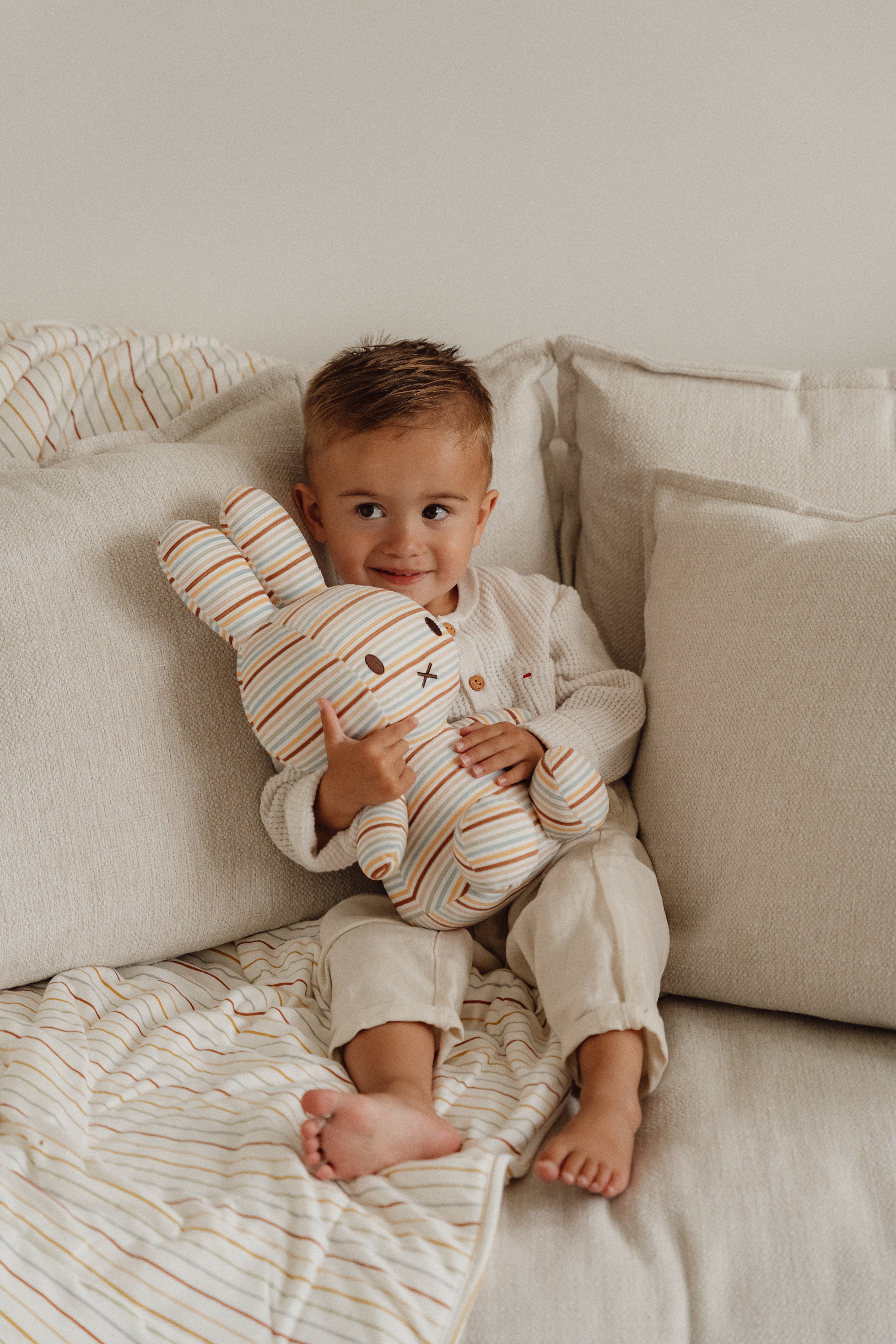 Vrolijke strepen in warme kleuren geven elk item een speelse retro-touch. Perfect voor kleine ontdekkers die dol zijn op beweging en plezier. Van speelgoed tot zacht textiel: een collectie vol energie en gezelligheid. Met een speciale Nijntje-samenwerking voor extra knuffelmomenten!